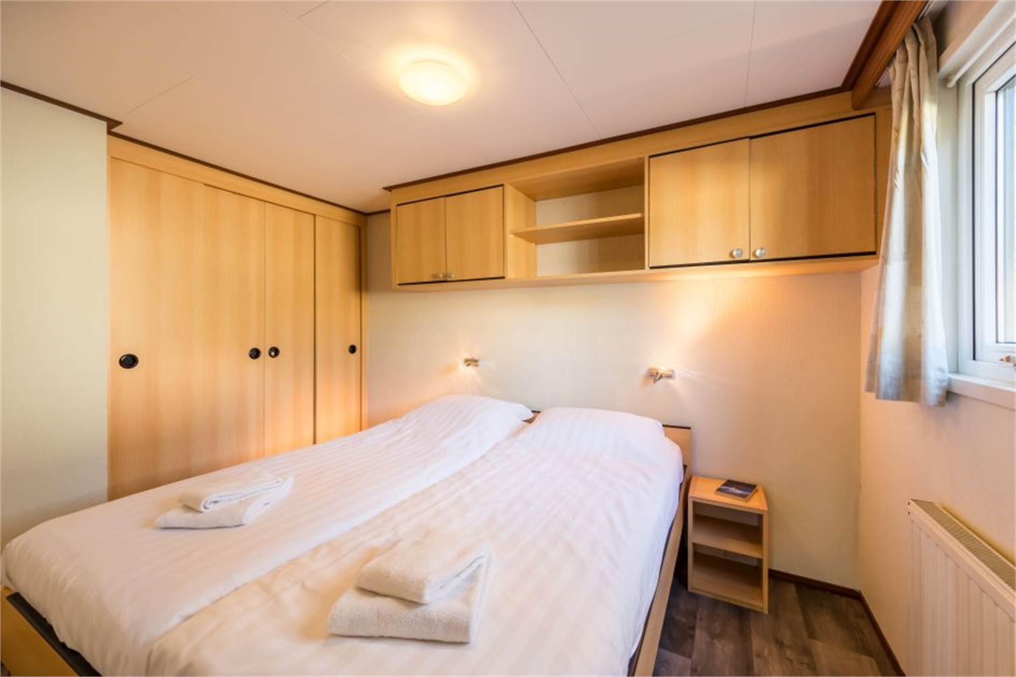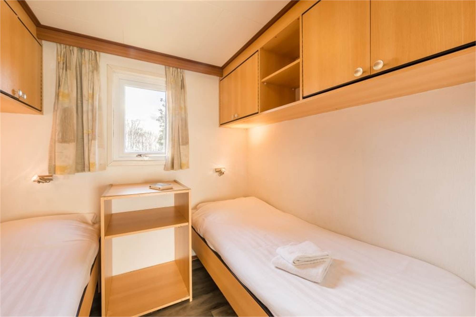 Dieses freistehende, ebenerdige Chalet eignet sich für 6 Personen. Das Chalet verfügt über ein Wohnzimmer und eine offene Küche mit Mikrowelle, Kühlschrank und Kaffeemaschine. Es gibt 3 Schlafzimmer, zwei davon mit 2 Einzelbetten und eins mit Doppelbett sowie ein Badezimmer mit Dusche und Toilette. Im Außenbereich finden Sie eine möblierte Terrasse und die Nutzung von WiFi ist gratis.