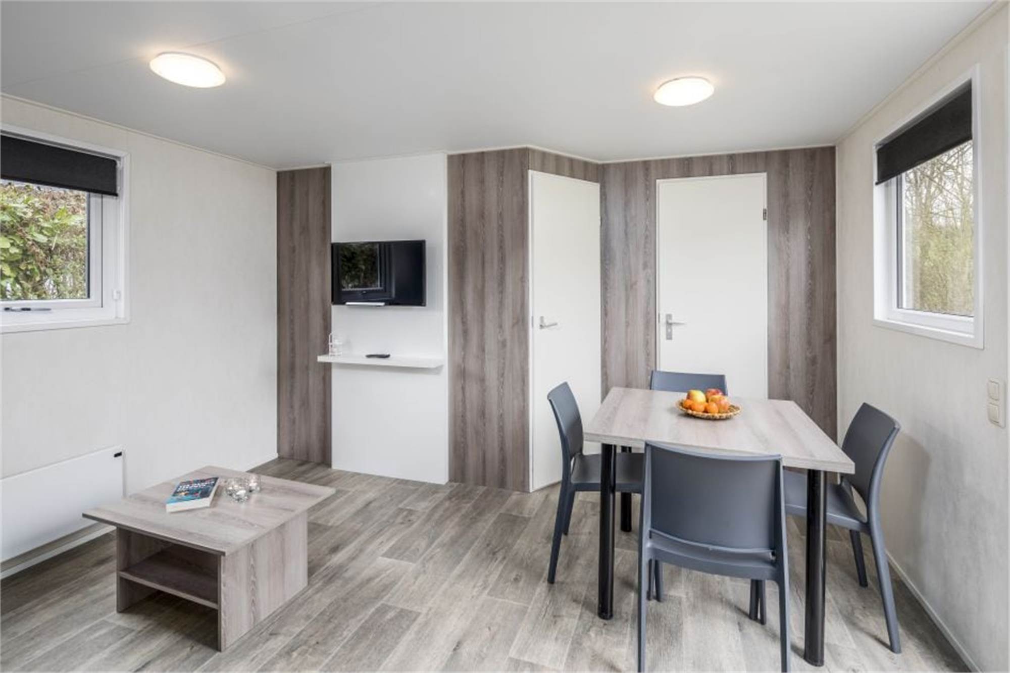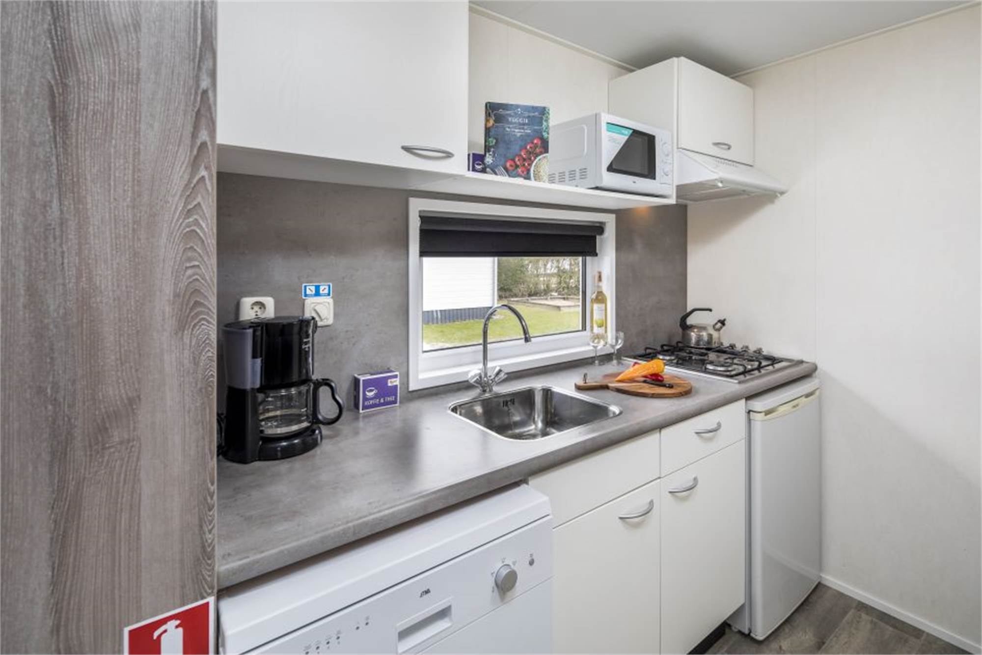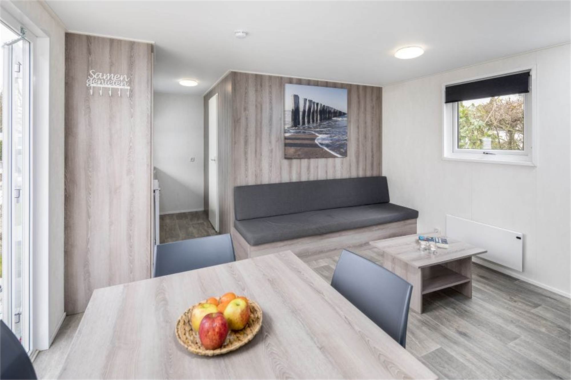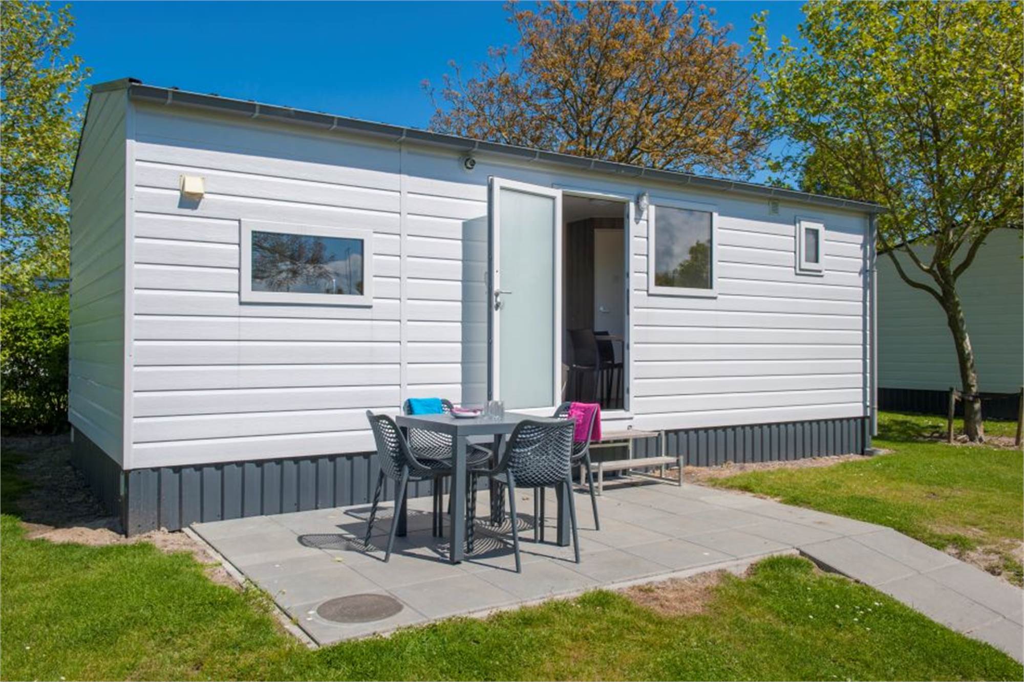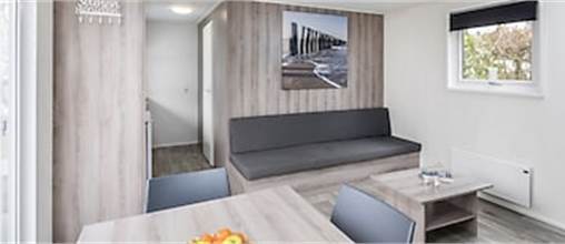 Dieses freistehende Mobilheim eignet sich für 3 Erwachsene und 1 Baby. Die Unterkunft ist mit einem Kinderbettchen, einem Kinderstuhle und eingezäuntem garten kinderfreundlich eingerichtet. Einteilung: Küche mit Geschirrspüler, Wohnbereich, Badezimmer, 1 Schlafzimmer mit Einzelbette und eins mit 2 Einzelbetten. Die Terrasse ist möbliert und die Nutzung von WiFi ist gratis.
