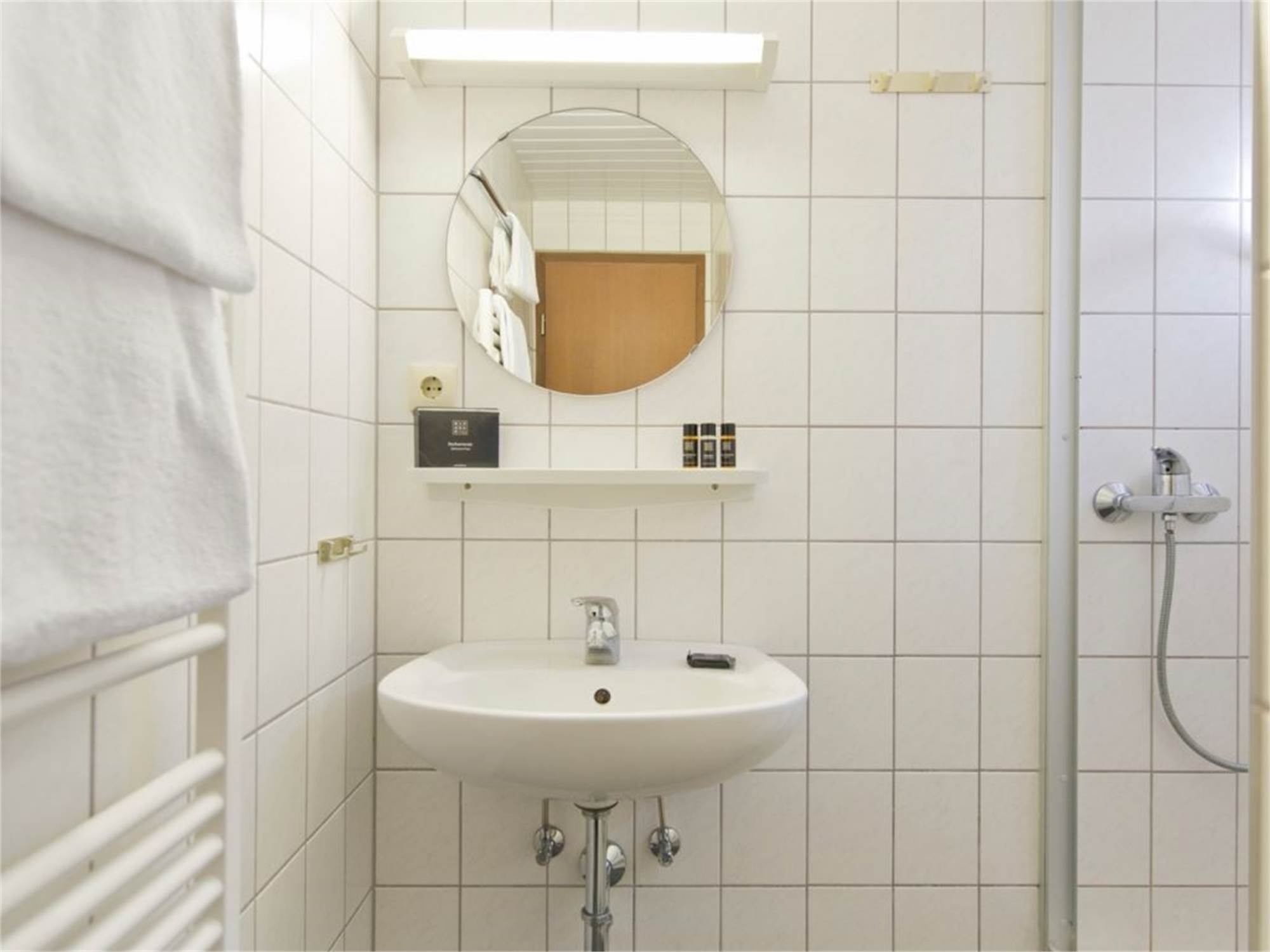 • Salle de bains avec cabine de douche et lavabo